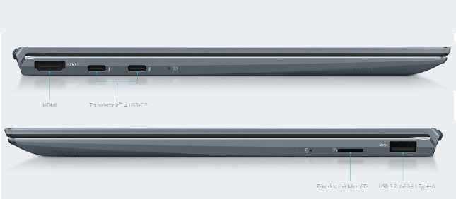 Asus ZenBook 13 UX325EA làm lại một định nghĩa hoàn toàn mới về những gì mà một chiếc laptop siêu mỏng nhẹ có thể có, mang tới cho người dùng một bộ cổng kết nối đầy đủ. Mỏng nhẹ là vậy nhưng Asus vẫn giữ lại cổng HDMI và USB Type-A cho UX325EA EG079T. Ngoài ra, người dùng còn được tận hưởng sức mạnh của Thunderbolt™ 4 qua hai cổng Thunderbolt™ 4 USB-C® hỗ trợ sạc nhanh, màn hình ngoài với chất lượng 4K UHD và tốc độ truyền gửi dữ liệu lên tới 40Gbps. Đầu đọc thẻ microSD dễ dàng trao đổi dữ liệu với các thiết bị di động khác.